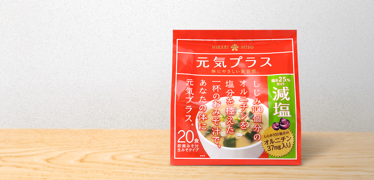しじみ100個分(37mg)のオルニチンを配合した即席味噌汁。『元気プラス オルニチン入りおみそ汁』に比べ塩分を約25%カットしました。