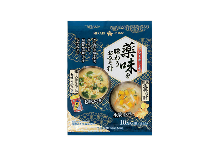 国産生姜を使った「生姜みそ汁」と、老舗・八幡屋礒五郎の七味唐からしを使った「七味みそ汁」の2種の粉末みそ汁10食のセットです。まろやかな信州味噌に、鰹節と宗田節の合わせ出汁が旨味とコクを引き立て、大人向けの本格的な味わいを実現しました。