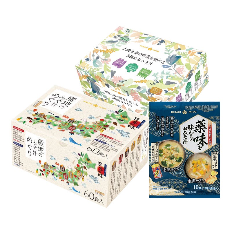 ひかり味噌通販部門で最も人気な即席みそ汁セットです。全国5産地のみそ汁を食べ比べできるたっぷり60食入りのアソートボックスです。産地の特色を手軽に便利に味わっていただけます。