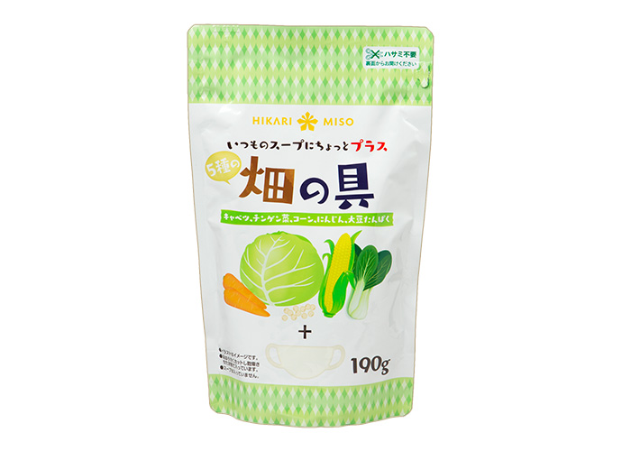 チンゲン菜、キャベツ、にんじん、とうもろこし、大豆たんぱくの5種類の具材をバランスよくミックスした常温保管可能な乾燥野菜です。スープやラーメン、みそ汁にプラスして、具材感たっぷり・彩り豊かにお楽しみいだけます。