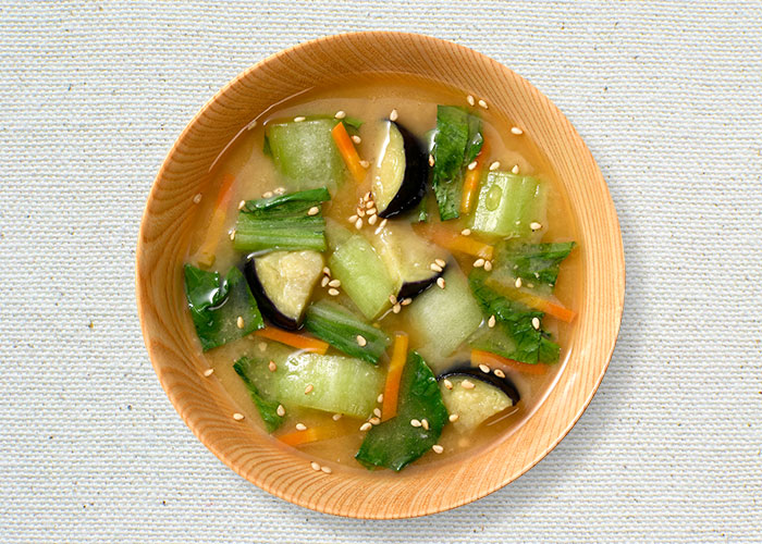 シャキシャキ感のある小松菜に長ねぎを加えた、満足感のある1杯です。他にキャベツや油揚げを加え、甘み・うま味をプラスしました。