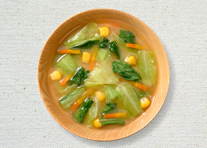 大きめにカットしたキャベツは、甘みも感じられ、お湯を注ぐと味噌の香りとともに、ふわっと広がります。キャベツの他に、チンゲン菜・コーン・にんじんが入っています。