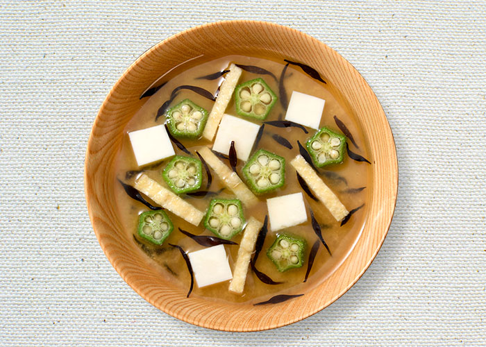 オクラの独特な風味を生かしたおみそ汁で、オクラを味わっていただけるよう、他の野菜は加えず、豆腐・油揚げ・ひじきを加えました。