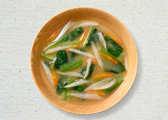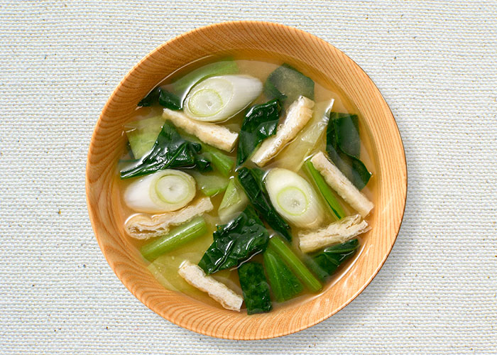 シャキシャキ感のある小松菜に長ねぎを加えた、満足感のある1杯です。他にキャベツや油揚げを加え、甘み・うま味をプラスしました。