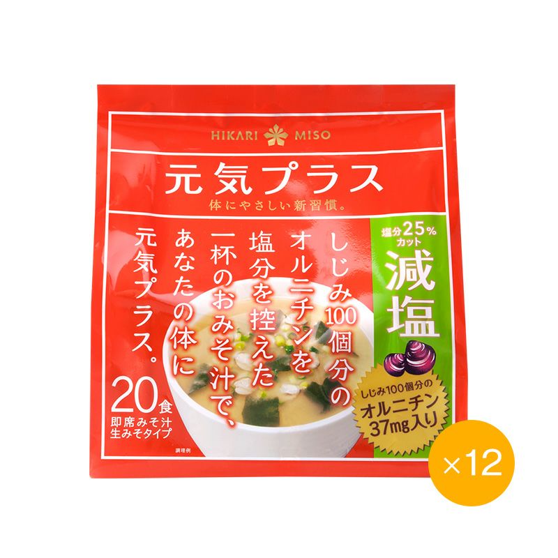 しじみ100個分(37mg)のオルニチンを配合した即席味噌汁。『元気プラス オルニチン入りおみそ汁』に比べ塩分を約25%カットしました。
