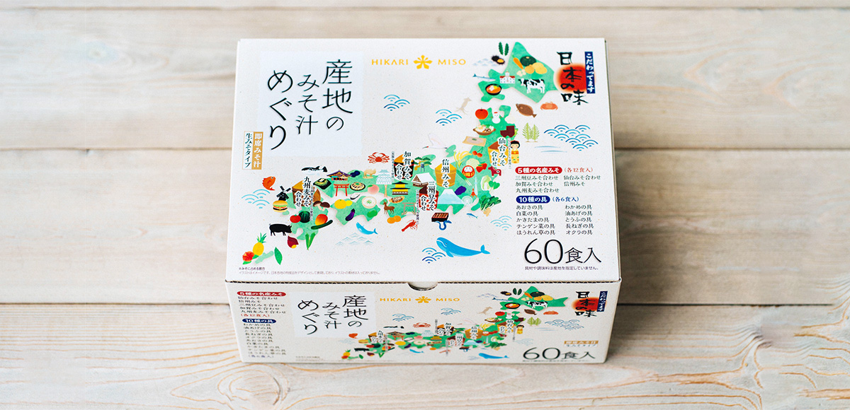 ひかり味噌通販部門で最も人気な即席みそ汁セットです。全国5産地のみそ汁を食べ比べできるたっぷり60食入りのアソートボックスです。産地の特色を手軽に便利に味わっていただけます。
