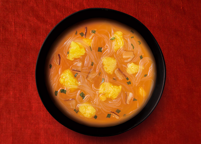 魚介としいたけのだしを効かせた、黒酢のコクとごま油の風味、唐辛子の辛みを加えたピリ辛スープです。具材にはかき卵、しいたけ、ねぎが入っています。