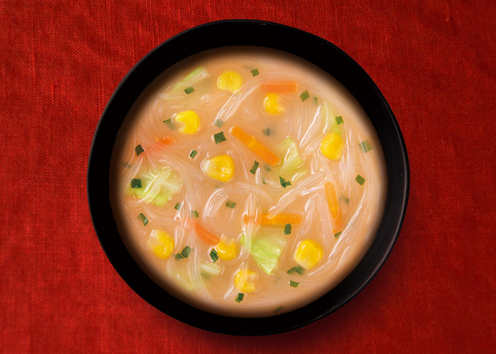 ポークと魚介のだしをベースに、唐辛子と黒胡椒、生姜、にんにくを加えたコクのある旨辛味噌スープです。具材にはコーンとねぎが入っています。
