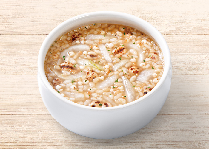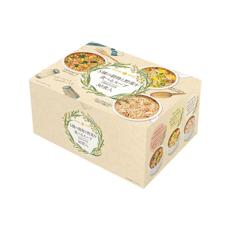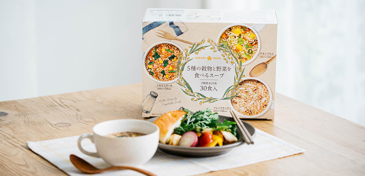 健康素材として人気の玄米や穀物が入った“食べる”スープです。 玄米と5種類の穀物は、お湯を注いだ時の食感を考えて焙煎加工し、彩りとして野菜や卵を加えました。1食あたりのカロリーは50〜54kcal。お弁当や間食にちょうどいいボリュームです。