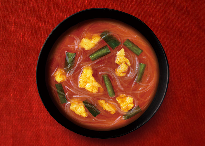 トマトの爽やかな酸味と旨みにチーズを隠し味として加え、唐辛子、にんにく、白・黒胡椒を加えた辛旨スープです。具材にはかき卵とニラが入っています。