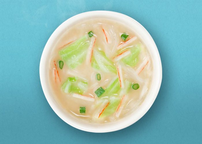 【シーフードスープ】食塩、乾燥キャベツ、ポークエキスパウダー、クリーミングパウダー、粉末しょうゆ、魚肉加工品、香辛料、乾燥ねぎ、あさりエキスパウダー、ごま油/調味料(アミノ酸等)、着色料(カラメル、紅麹)、炭酸Ca、膨張剤、加工でん粉、(一部に卵・乳成分・小麦・かに・ごま・大豆・豚肉を含む)