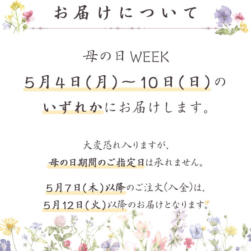 - 5月6日(水)までのご注文(ご入金)で母の日の5月10日(日)までにお届けいたします。