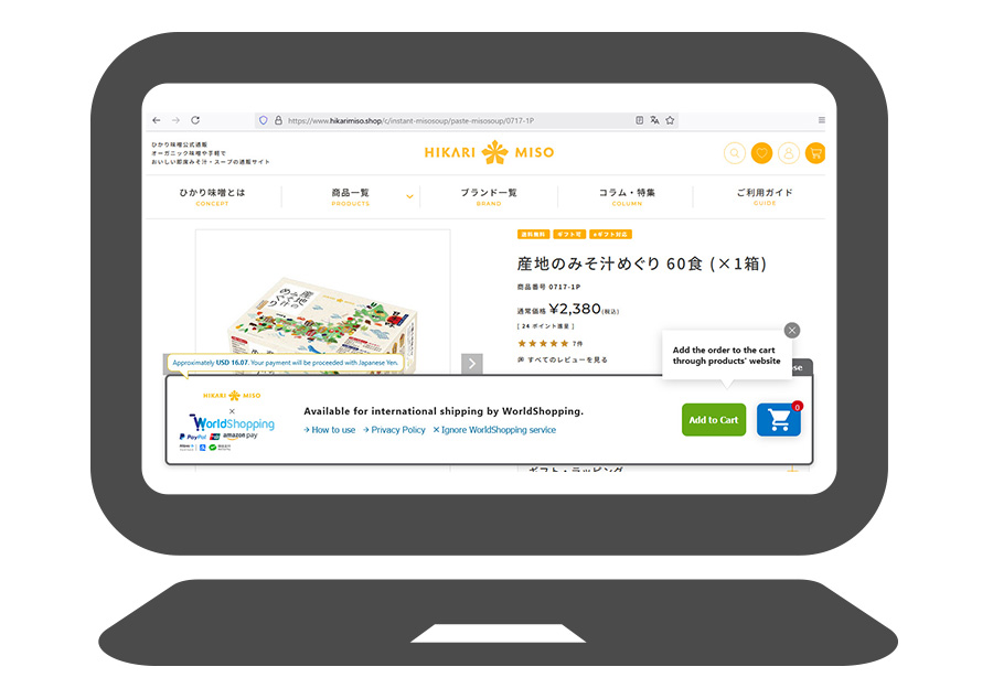 - When you access hikarimiso.shop from outside Japan, the WorldShopping cart will be displayed automatically.
