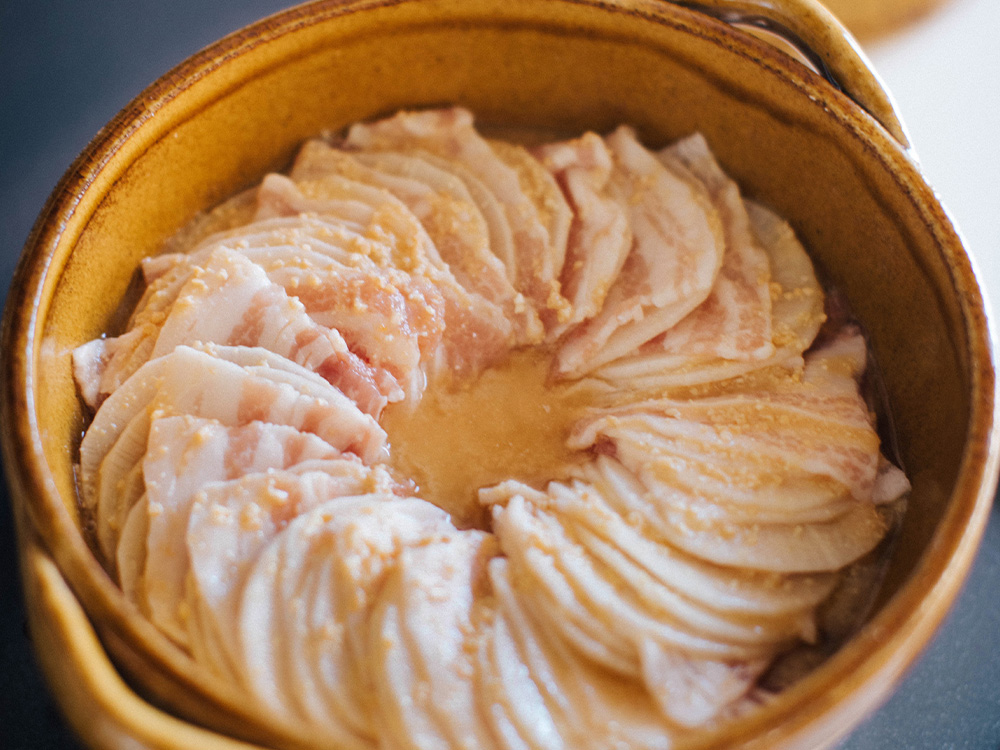 - 鍋に昆布をしき、大根1〜2枚と豚バラ肉を交互に重ねて入れ、円状に並べる。水に味噌『国産素材 信州こうじみそ』を溶かしたら、鍋に流し入れる。